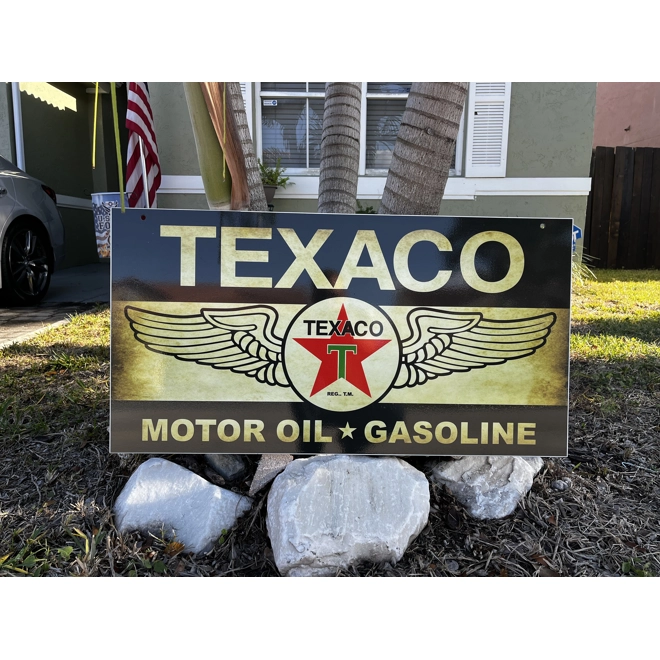Double-sided Texaco Sign, Gas Station Decor, Reproduction, Vintage Signage, Large Texaco Sign, Metal Sign, Garage Shop Farm Decor, Man Cave Garage Sign This sign stands approximately 18.5" tall x 35" wide! This sign is made from a Strong Aluminum Composite & Expanded Polyethylene panel. It is sturdy yet lightweight making it super easy to hang! At approximately 0.15mm thick, this sign is not at all a thin tin sign. We use only the best quality materials when it comes to our signs! Our Graphic Artists go above and beyond to make sure your sign has a crisp and clear image. Our Sign Makers and Quality Control make us your first choice in signs! Our Packing Department is 100% dedicated to making sure your sign is packed safe to ensure you receive your package undamaged! This Sign is a Great Space Filler and an Eye Catcher to Any Wall! Hang it Indoors or Out! That's right! Our Signs are outdoor durable! We have signs still proudly hanging with no signs of any kind of fading, cracking, or peeling etc. If you have any questions please CONTACT US AT: lenicegraferetsy@gmail.com Sign Specifications: Two polyester pre-painted sheets of .15 mm aluminum bonded to a solid, 100% recycled polyethylene core Our 100% recycled LDPE polyethylene core offers both flexibility and rigidity for a wide range of applications Our aluminum alloy offers a continuous flat and rigid surface Less mineral content in the core is smoother and easier on routing bits Quality, long-lasting aluminum composite panel Lighter weight than aluminum or MDO Resists scratching and denting better than wood panels Low tack protective liner reduces both residue and static Can be cut or routed with ease Fire rated to ASTM E84 FHWA approved We love hearing from all of our customers! Texaco Sign, Old Texaco Sign, Gas Station Sign, Vintage Sign, Garage Sign, Collection Sign, Home Living, Office Decor, Fathers day gift, Gas Sign, Texaco Old Sign, Man Cave Garage Sign Art & Collectibles, Aluminum Alloy board, Vinyl, Gas Pump Decor, Vintage Look, Garage Decor, Home Living, Room Lighting, Man Cave Light, Gas Pump Light, Heavy Steel Sign, Texaco T Star Sign PLEASE SEND US A PHOTO OF YOUR NEW SIGN HANGING SO WE CAN DISPLAY IT IN OUR SITE. THANK YOU